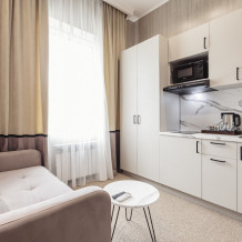 Дизайнерские светлые номера с кухней (варочная панель, микроволновая печь, холодильник, посуда, столовые приборы, чайная станция).