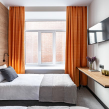 В номере: телевизор, кондиционер, шкаф, вешалки, зеркало, тумба письменный стол, стул, тапочки, светонепроницаемые шторы.