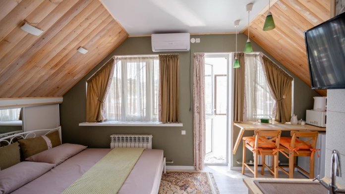 Сдаю посуточно студию на мансарде в Кисловодске с видом на горы (район Свято-Никольского собора). До источника Нарзана 5-10 минут пешком, до курортного парка 3-5 минут. В квартире есть все необходимое для комфортного отдыха и проживания: мебель, телевизор, холодильник, стиральная машинка, постельное белье, посуда и т. д. Круглосуточно холодная и горячая вода. Парковка рядом. Во дворике беседка, мангал. Встретим по приезду.
