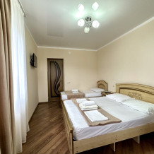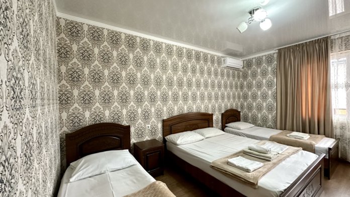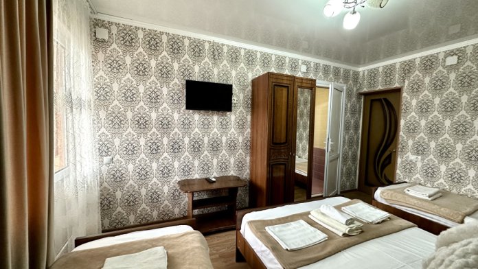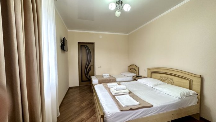 Добро пожаловать в наш уютный трехместный номер. Вас ждет просторная комната с интерьером в теплых тонах, которая создаст атмосферу уюта. В номере есть большая и удобная двуспальная кровать , односпальная кровать и все необходимое для отдыха