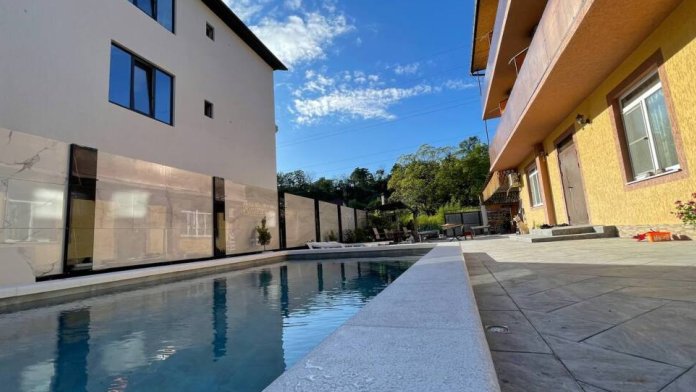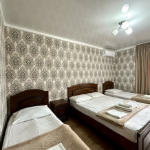 Трехэтажный дом, с внутренним зеленым двориком, есть мангал и бассейн. На третьем этаже есть общая кухня и на первом этаже летняя. Большие, просторные номера.