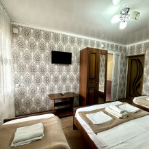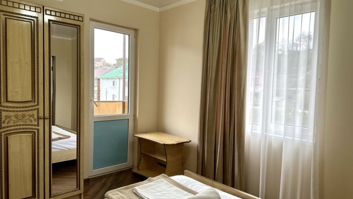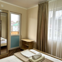 Номер «Комфорт» с балконом, с двуспальной кроватью и двумя односпальными кроватями для семьи. Уютный номер полностью оборудован всем необходимым для отдыха с душевой комнатой.