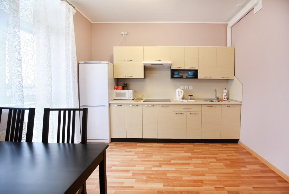 - Микроволновая печь, электрочайник и кухонные принадлежности.