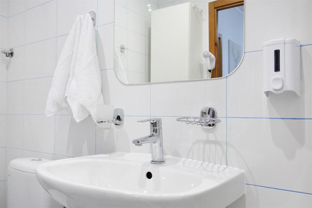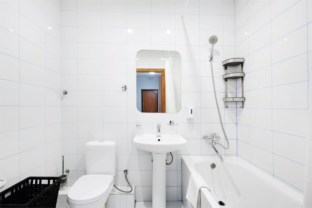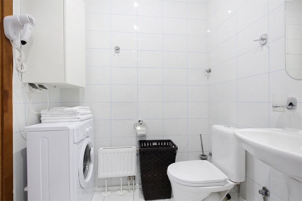 - Санузел оснащён современной сантехникой, стиральной машиной и феном.