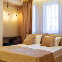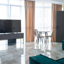 Эта категория предусматривает наличие дополнительного места в виде односпального раскладывающегося кресла. Просторные и уютные апартаменты с лаконичным дизайнерским ремонтом, оборудованные и оснащённые всем необходимым: большая двуспальная кровать (в некоторых номерах доступны 2 односпальные кровати), телевизор со Smart TV, сплит-система. Сейф, вместительный шкаф для хранения вещей. Кухонный блок со всей техникой и бытовыми принадлежностями для приготовления. Просторный совмещённый санузел с душевой кабиной. Фен, полотенцесушитель, стиральная машина, сушилка для белья, утюг, гладильная доска.