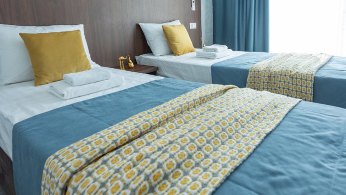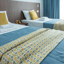 Уютный двухместный номер оборудован индивидуальной системой климат контроля, двумя кроватями с ортопедическими матрасами или двуспальной кроватью с превосходным ортопедическим матрасом. Для тех, кто совмещает отдых с работой организовано рабочее место. В номере новый шкаф для одежды, прикроватные тумбы, пуф, телевизор с плоским экраном и спутниковым TV, холодильник. В Вашем распоряжении ванная комната с душевой кабиной.