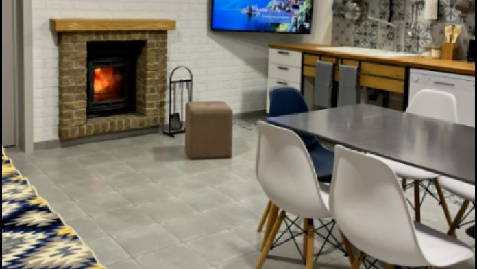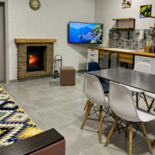Нa 1 этaже наxодятся: куxня-столовая-гостиная (раскладной двухместный диван), русская баня на дровах, ванная комната, с/у, большая крытая терраса с зоной барбекю и местом для отдыха.