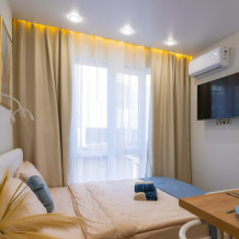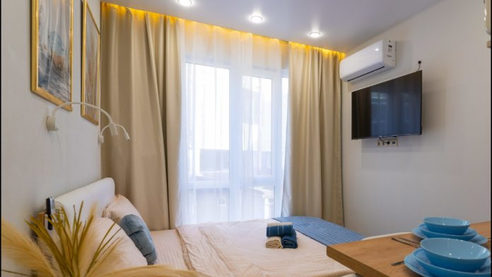 Небольшая, по просторная студия станет отличным вариантом для размещения двух человек.