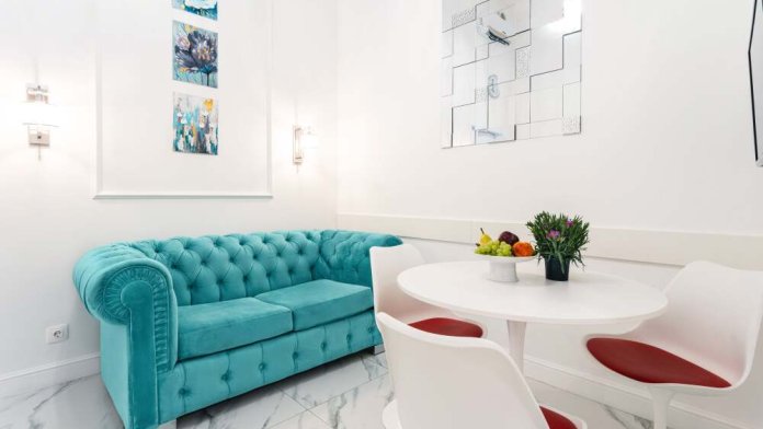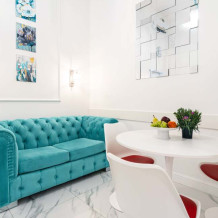 Двухуровневые Апартаменты оснащены двуспальной кроватью и раскладным диваном.Имеется кондиционер, телевизор, мини-холодильник. В санузле душ, фен, набор полотенец. Площадь - 29, 2 кв.м. (10 кв.м. - первый уровень, 9 кв.м. - второй)