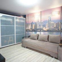 В комнате есть двуспальный угловой диван, шкаф-купе для одежды, журнальный столик и большой ЖК-телевизор. Также установлен кондиционер сплит-система.