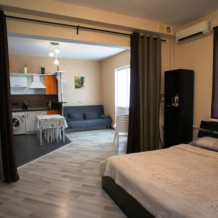В комнате есть двуспальная кровать, платяной шкаф, столик, тумбочка и большой ЖК-телевизор. Кондиционер-сплит-система обеспечивает комфортный микроклимат.