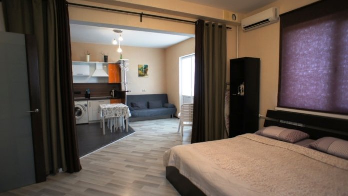Площадь квартиры составляет 55 квадратных метров. Она представляет собой студию с перегородкой между комнатами в виде плотной занавески и отдельным входом из прихожей в каждую комнату.