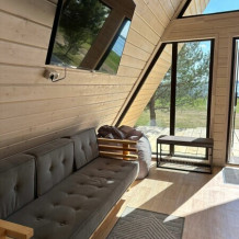 В доме двуспальный диван на первом этаже, одна двухспальная кровать на антресольном этаже. Санузел расположен внутри дома (душ, туалет, бойлер)