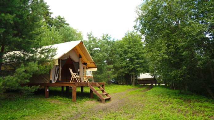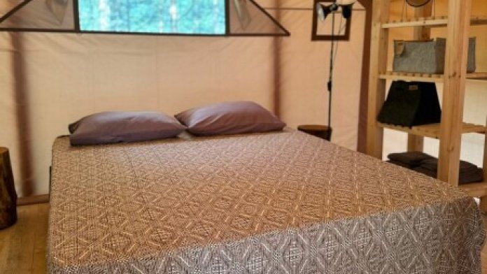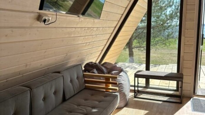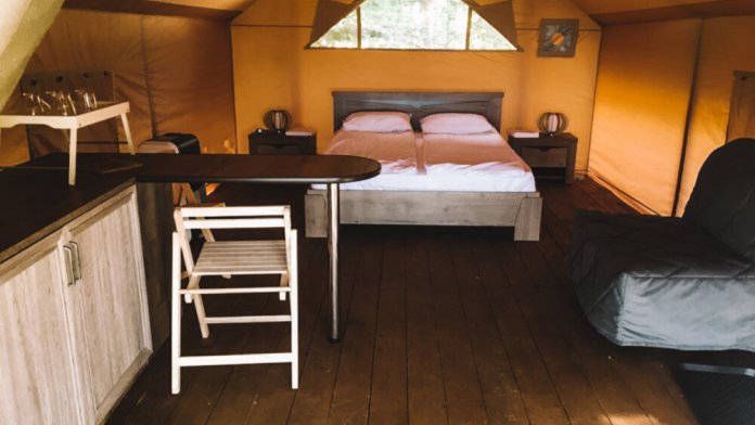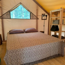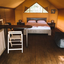 Улучшенный сафари-тент с видом на озеро. Внутри палатки: - мини-кухня - стол для приема пищи - кровать - диван - вешалка - стеллаж У каждой палатки свой индивидуальный санузел (закрывается на ключ) в недалеком удалении от палатки.