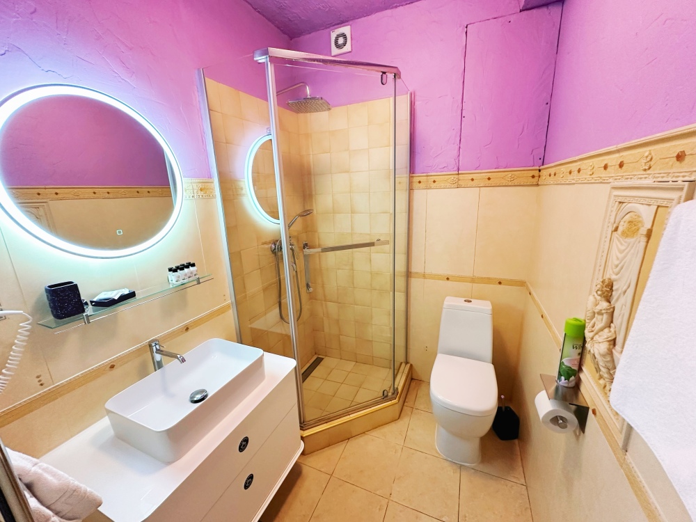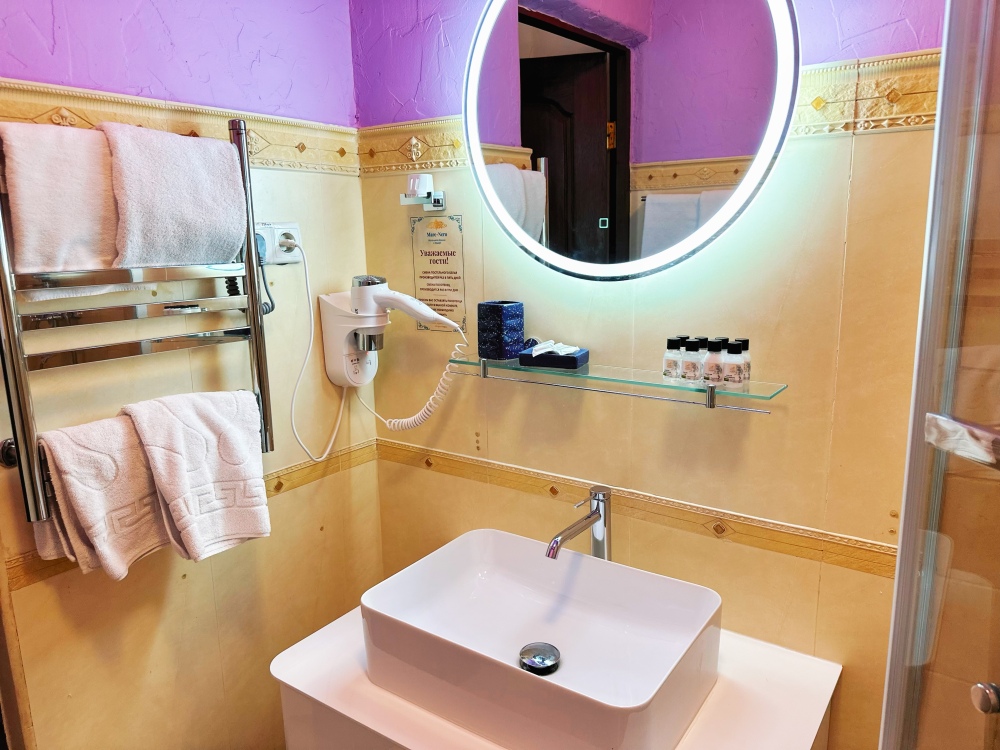 - душевая кабина(либо ванна), фен, халаты, тапочки, полотенца + пляжные полотенца, косметика марки «Русские традиции»