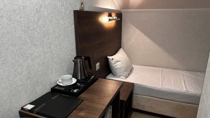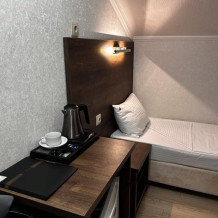 Номер площадью от 10 кв.м. Состоит из комнаты c односпальной кроватью, прикроватной тумбы, чайным набором, стул, кондиционер и холодильник. В собственной ванной комнате расположены: душ, туалет, раковина и фен.