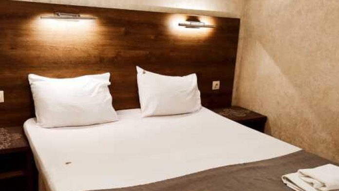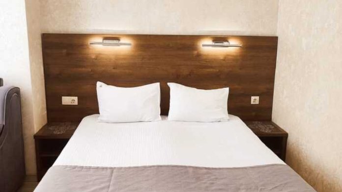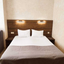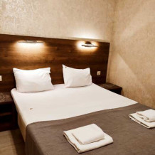 Номер площадью от 15 кв.м., с двуспальной кроватью, прикроватными тумбами, шкаф, телевизор, стол-трюмо, чайный набор, зеркало, стул, холодильник и кондиционер. В собственной ванной комнате расположены: душ, туалет, раковина и фен.