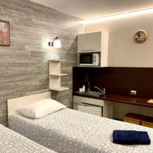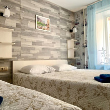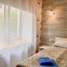 Мы расположены на первом этаже, а окна выходят в тихий зеленый дворик. Рады предложить Вам несколько категорий номеров: трёхместный Комфорт, двухместный номер с 2 раздельными кроватями, двухместный Делюкс и одноместный номер.