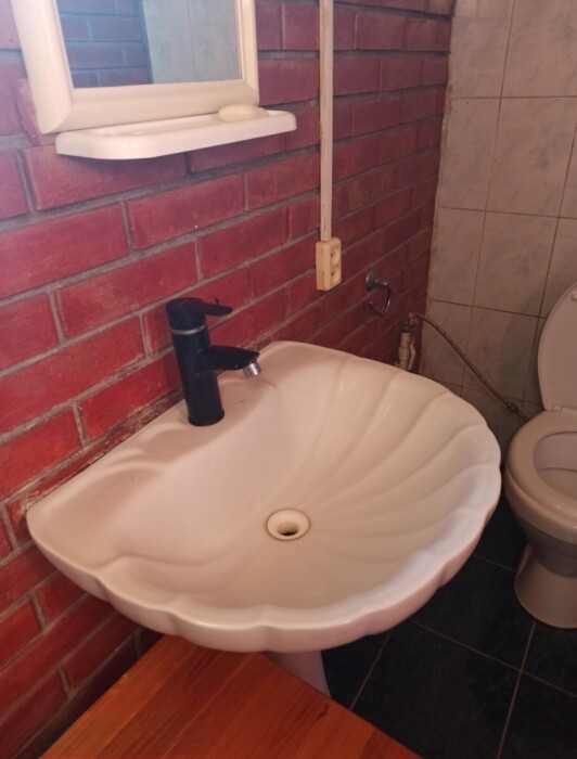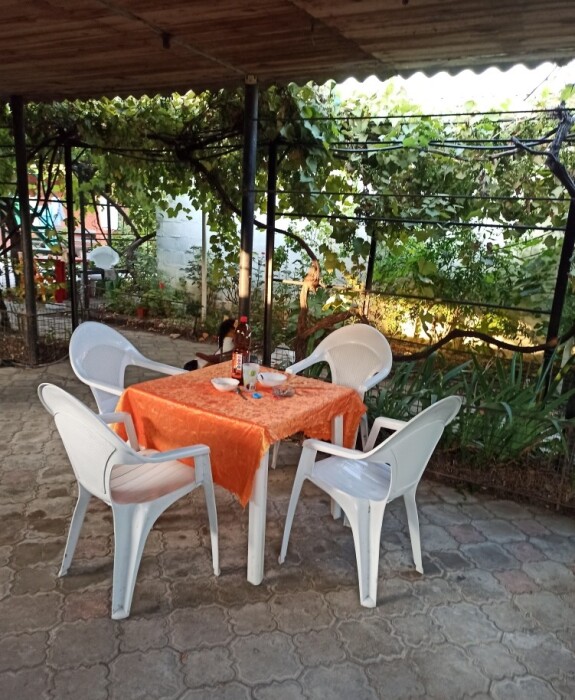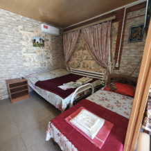 4-местный номер со всеми удобствами, на 1 этаже кирпичного дома: душ, туалет, кухня, посуда, холодильник, ТВ, сплит система, всё есть, стол на улице. А также детская площадка и большая зона отдыха с диванами, столиками и мангалом.