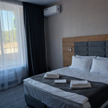 Номер стандарт расположен на первом этаже нашего отеля, вид из окна выходит на окрестности окруженным зеленью и свежим воздухом, что создает уютную и спокойную атмосферу для отдыха. Вы сможете насладиться тишиной и покоем, отдохнув от городской суеты и шума. Возможность размещения до трех человек позволяет семье или компании друзей насладиться отдыхом вместе, не переживая о нехватке места.