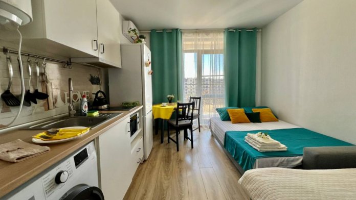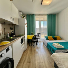 Студия полностью укомплектована: мебель, техника, посуда, постельное белье. Чаепитие на балконе с прекрасным видом вам также доставит удовольствие. Дом с лифтом.