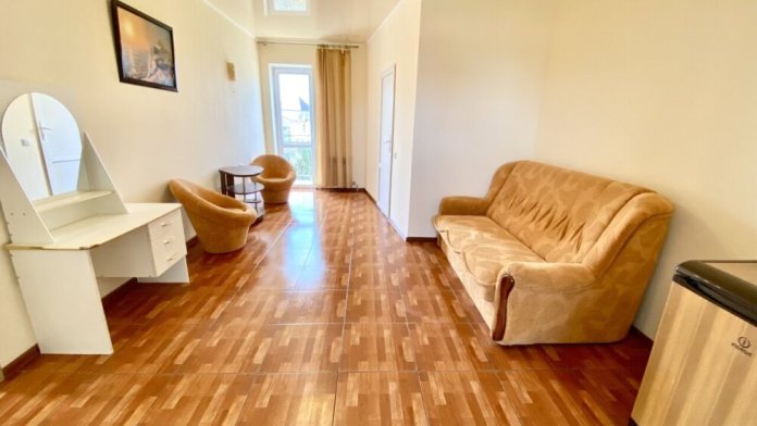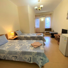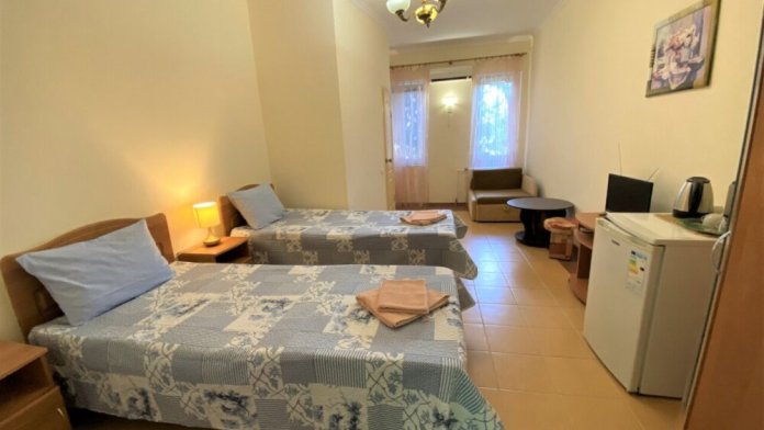 Двухкомнатный номер, в нем имеется с/у, душ, чайник минимальный набор посуды, кондиционер, телевизор, холодильник.