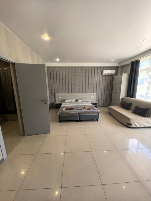 Четырехместный полулюкс без балкона, расположен на первом этаже гостиницы, общей площадью 29кв.м. В номере представлены кровати спринг бокс и раскладное мягкий диван, сан узел. Оснащен кондиционером, ТВ, шкафом, прикроватными тумбочками, столик.