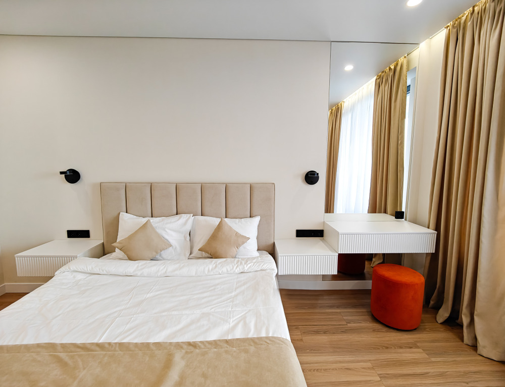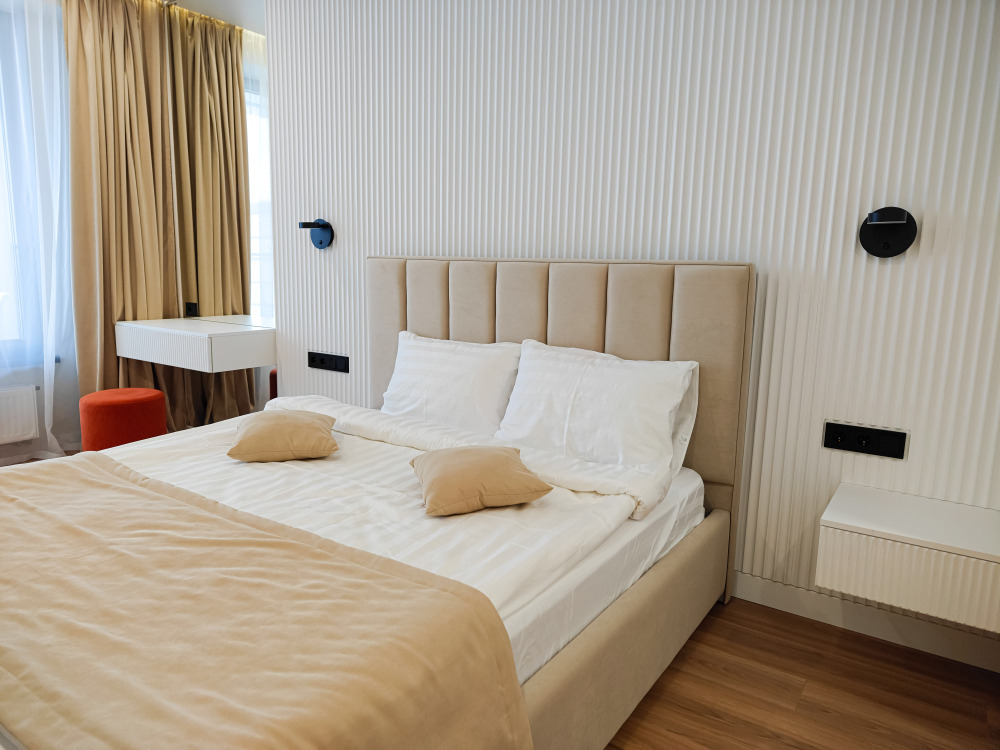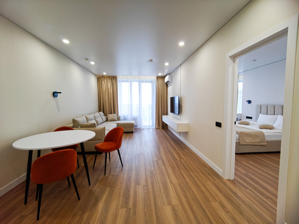 Уютные и просторные двухкомнатные апартаменты со всеми удобствами, оформленные в современном стиле, идеально подходят для отдыха семейной пары и компании друзей. Комфортное размещение двоих гостей на основных местах, двоих гостей на дополнительных местах и одного ребенка до 5 лет включительно без дополнительного места бесплатно. Номера расположены на 1,3,4 и 6 этажах.