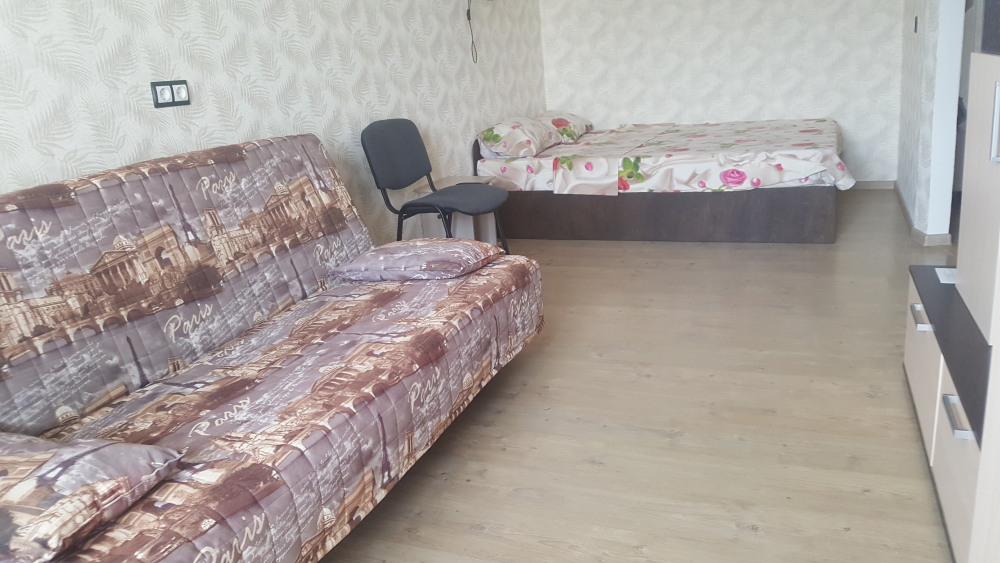 В спальной комнате двуспальная кровать и раскладной диван, на кухне еще один диван.