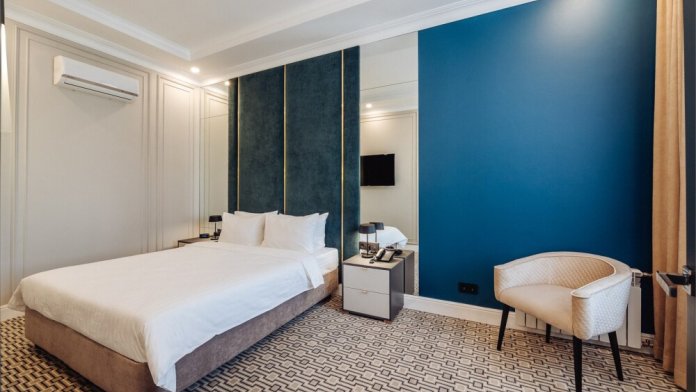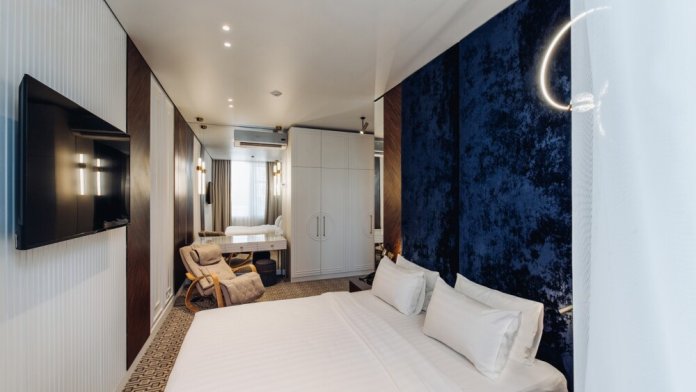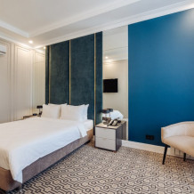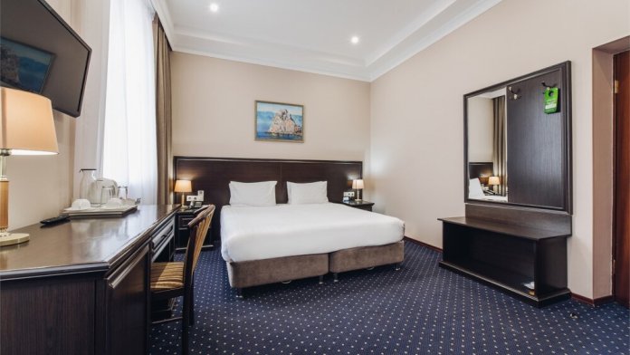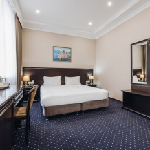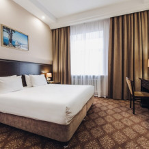 Просторный комфортабельный номер с большой двуспальной кроватью, оформлен в современном элегантном стиле и оснащен удобным рабочим местом. В номере: кондиционер, мини-бар, набор для чая и кофе и минеральную воду. Во всех номерах кабельное телевидение, телефон, беспроводной интернет. В распоряжении гостей отдельная ванная комната с ванной , где каждый найдет фен, тапочки, купальные халаты и косметические наборы. В каждом номере два окна, а также кофейные столики, дополняющие номера уютом.