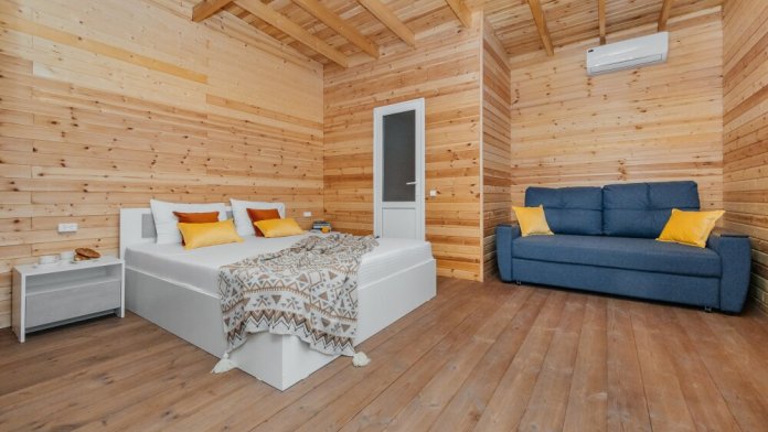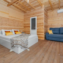 Для наших гостей мы предлагаем коттеджные домики, полностью оборудованные для комфортного проживания. В каждом домике и номере есть фен, гардероб. Также есть ТВ, WI-FI, имеется кондиционер и ванная комната. В номере стоит большая двуспальная кровать и комфортный двуспальный диван.