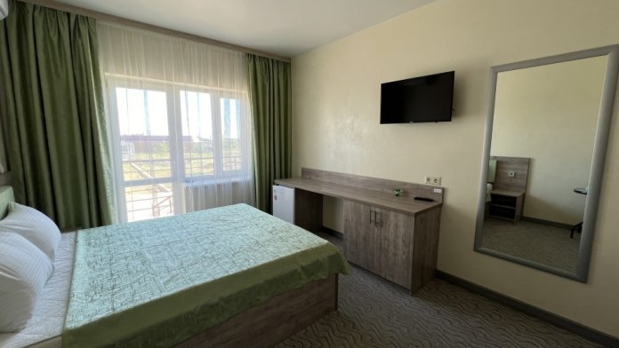 Просторные уютные комнаты с видом на море и Сакское грязевое озеро. В каждой комнате есть: санузел, телевизор с выходом в интернет, холодильник, посуда, сплит-система, кровати с ортопедическими матрасами, просторный балкон. Все комнаты с электронными замками. На каждом этаже есть микроволновая печь, гладильная доска, пурифаер с горячей водой.