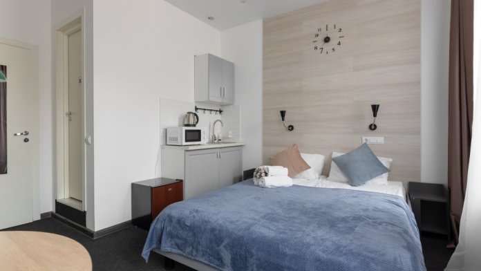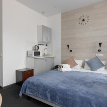 В распоряжении гостей: ванная комната (душ/туалет/раковина), двуспальная кровать или две односпальные кровати (по запросу), необходимые косметические и гигиенические средства (шампунь, мыло, гель), комплект домашнего текстиля, телевизор, холодильник, кухонный уголок с чайником и микроволновой печью, 2 тарелки/2 стакана, фен, прикроватные светильники, розетки у изголовья, шторы блэк-аут для комфортного сна.