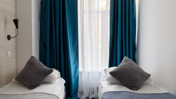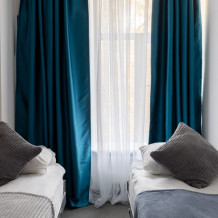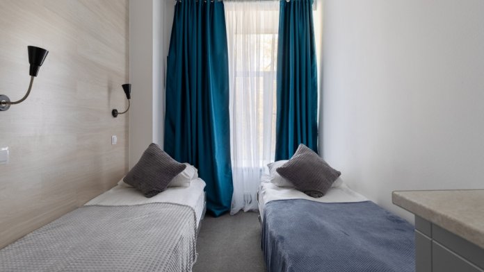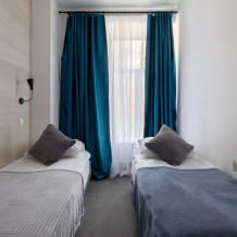 В распоряжении гостей: ванная комната (душ/туалет/раковина), две односпальные кровати, необходимые косметические и гигиенические средства (шампунь, мыло, гель), комплект домашнего текстиля, телевизор, холодильник, фен, прикроватные светильники, розетки у изголовья, шторы блэк-аут для комфортного сна.