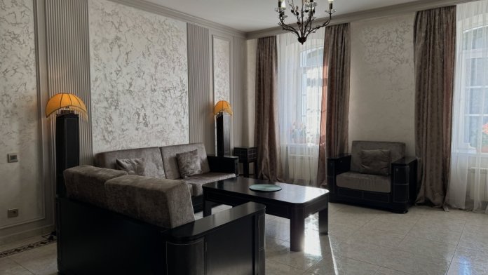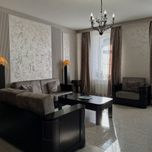 В Апартаменте использовались только дорогие материалы. Вся мебель из красного дерева выполнена под заказ и была привезена из Германии. Мраморный пол и подоконники итальянских мастеров. Мягкая мебель европейских производителей. Качественная техника и сантехника.