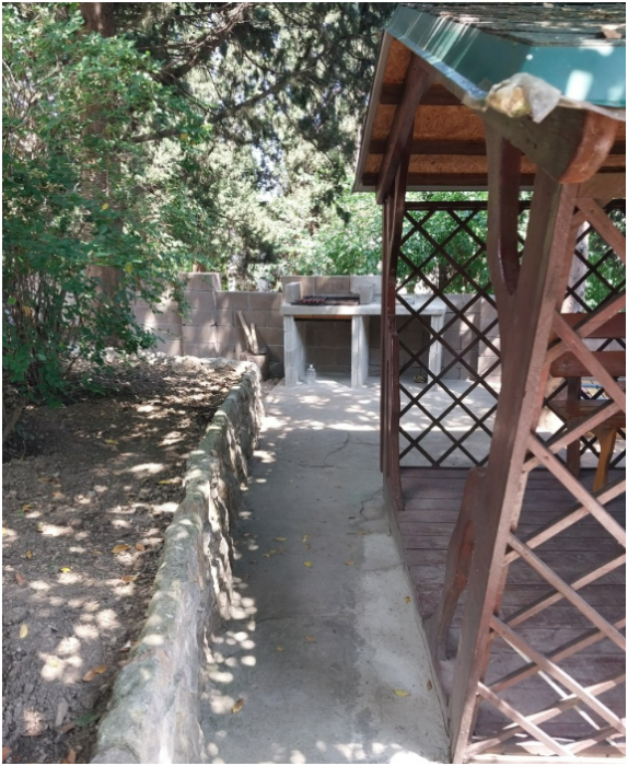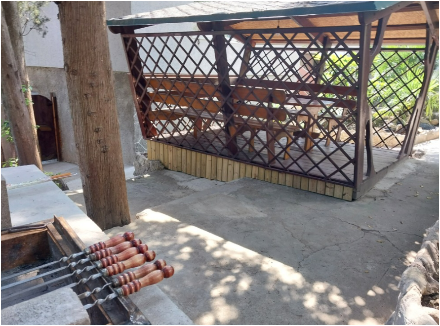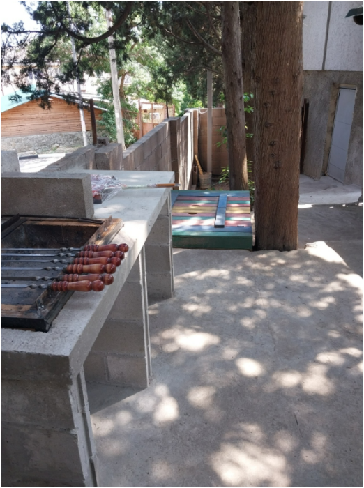Домик рассчитан на 2-6 гостей, имеется кухня, санузел, прихожая, две комнаты, телевизор, кабельное, Wi-Fi, кондиционер. Во дворе зона отдыха на свежем воздухе с беседкой и мангальной зоной.