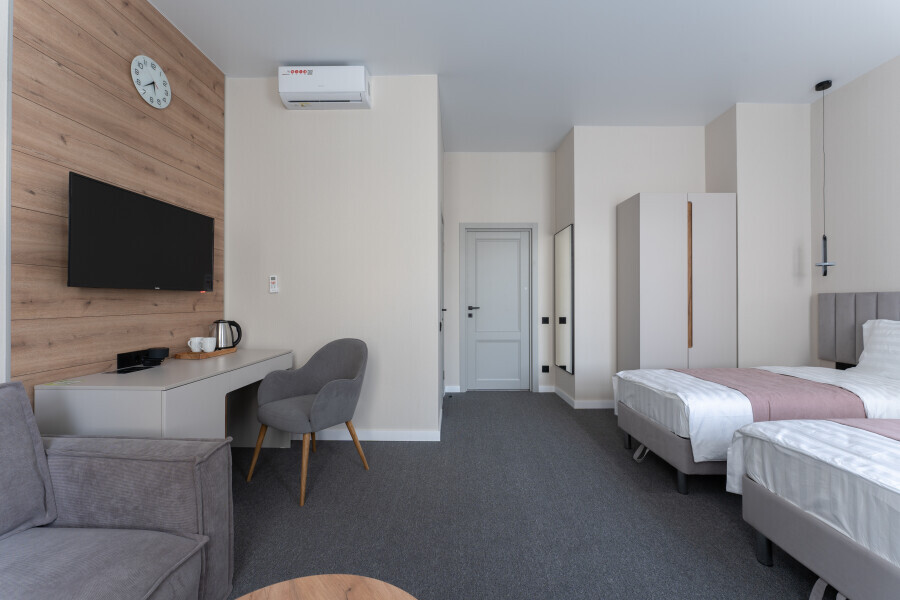 В номере: Яндекс станция Алиса с функцией инфоконсьерж, TV и аудио, wi-fi, кондиционер, сейф, холодильник, гардеробный шкаф, письменный стол, стул, душевая комната, приборы гигиенической косметики, фен, белье премиального качества.
