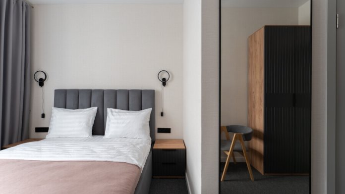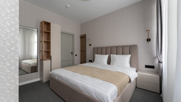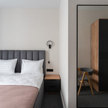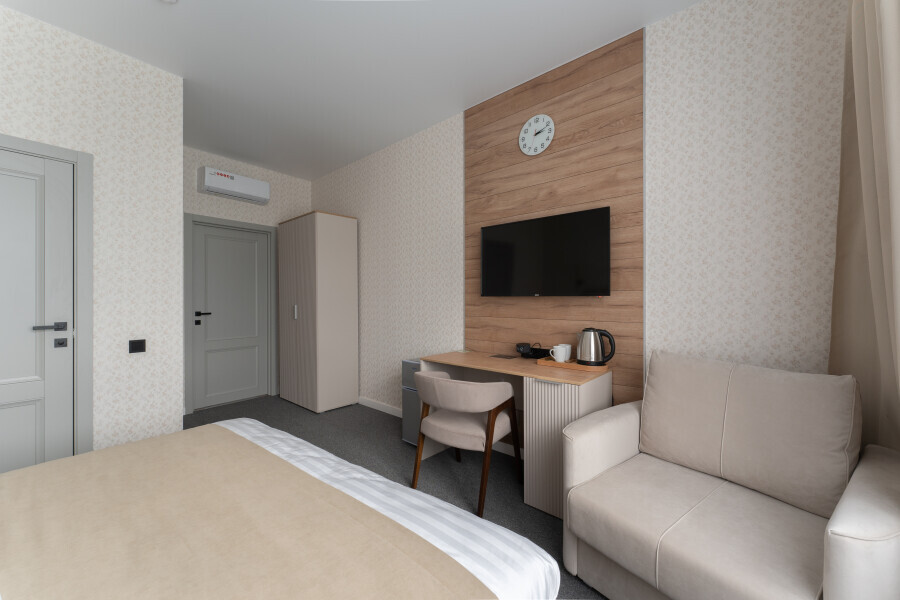 Оснащен: односпальная кровать 90/200, Яндекс станция Алиса с функцией инфоконсьерж, TV и аудио, wi-fi, кондиционер, холодильник, сейф, гардеробный шкаф, письменный стол, стул, душевая комната, приборы гигиенической косметики, фен, белье премиального качества.