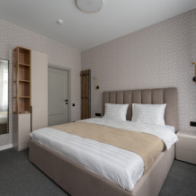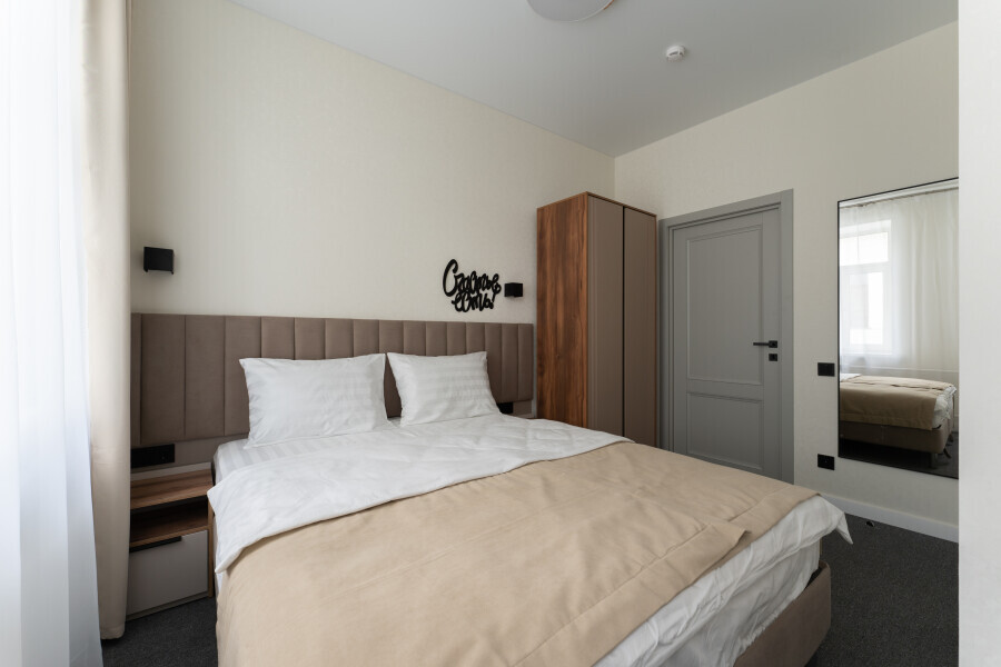 Люкс номер с одной большой кроватью размер 180/200. Оснащен Яндекс станция Алиса с функцией инфоконсьерж, TV и аудио, Wi-Fi, кондиционер, сейф, холодильник, гардеробный шкаф, письменный стол, стул, душевая комната, приборы гигиенической косметики, фен, белье премиального качества.