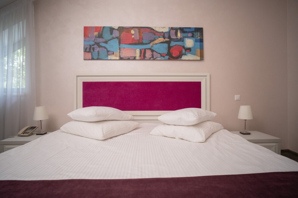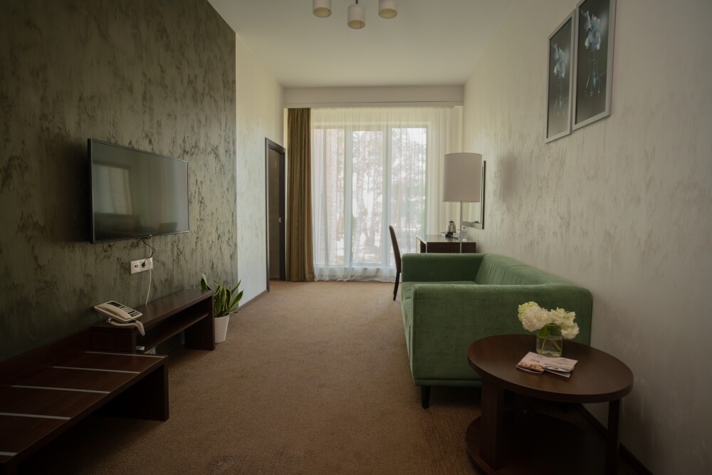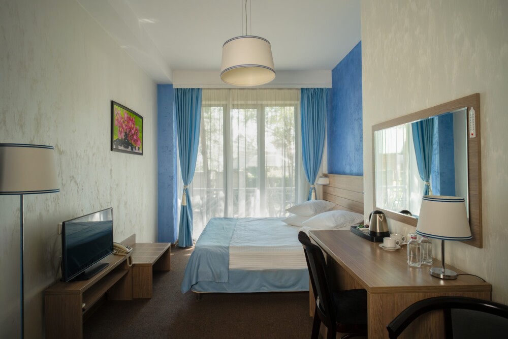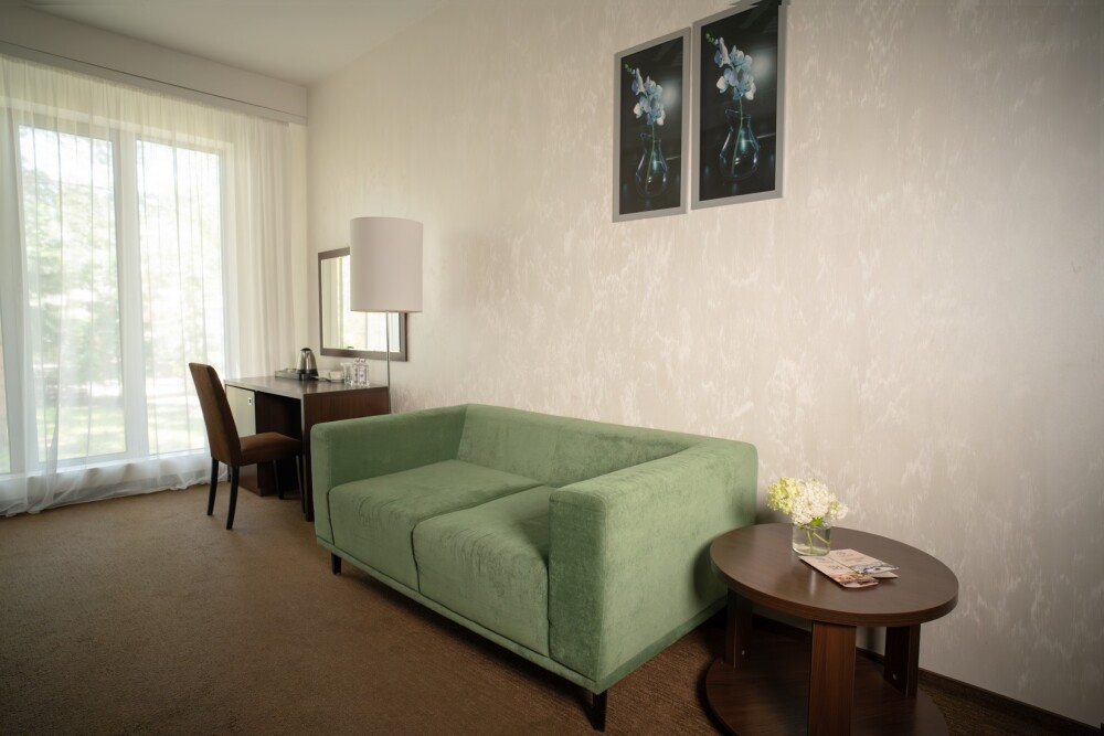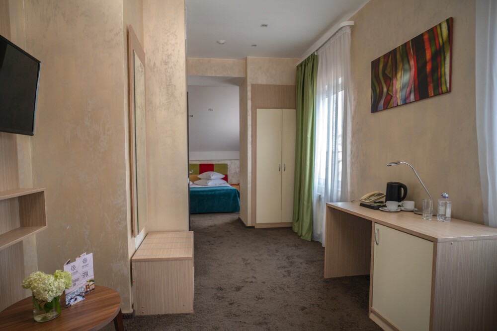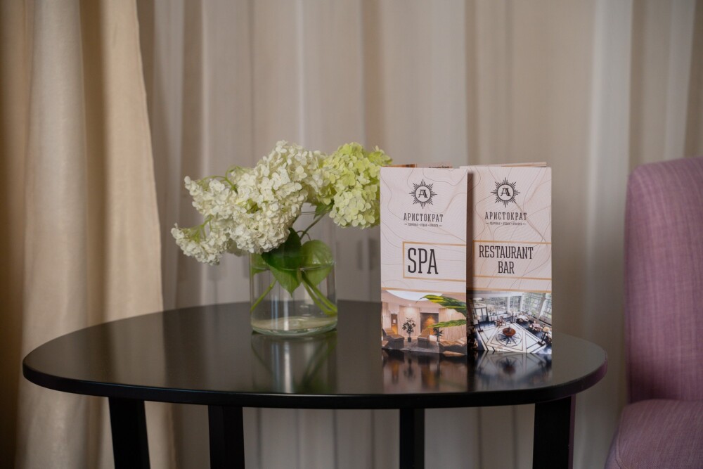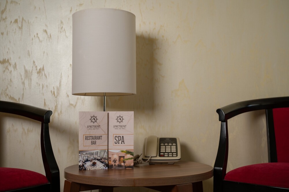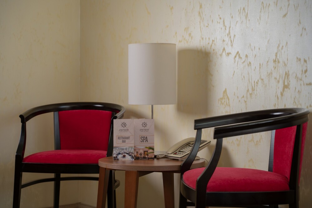 Двухкомнатный номер категории «Люкс» располагает спальню и гостиную с балконом. Подходит для комфортного проживания и оснащен всем необходимым. В стоимость проживания включены:посещение SPA-комплекса Аристократ с бассейном, сухой финской сауной и турецким хамамом, континентальные завтраки,детская площадка,