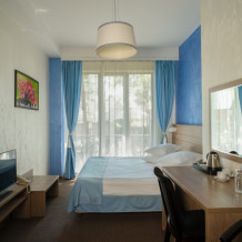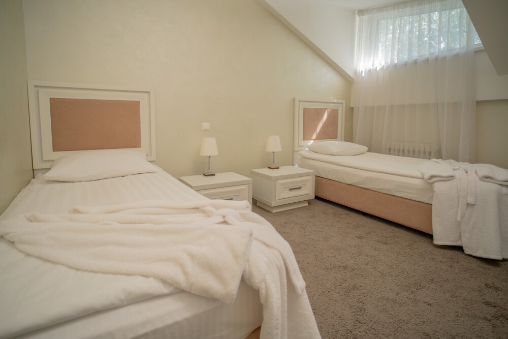 Однокомнатные номера категории «Deluxe Twin» подходят для комфортного размещения 2 гостей и оснащены всем необходимым для проживания: креслами и журнальным столиком, рабочим местом, шкафом, двумя раздельными односпальными кроватями, телевизором, мини-баром и индивидуальным санузлом (с душевой кабиной), балконом Возможна организация 1 дополнительного места за отдельную плату.