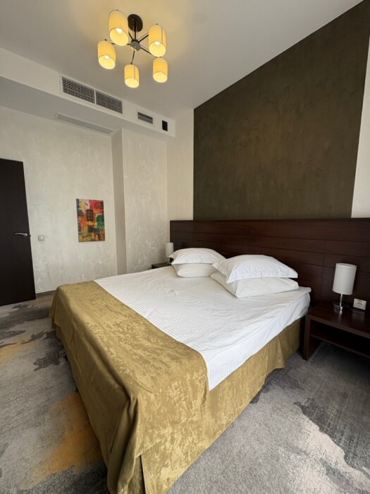 Однокомнатные апартаменты с мини-кухней категории «Studio» подходят для комфортного размещения 2 гостей и оснащены всем необходимым для проживания: полноценным рабочим местом, шкафом, двуспальной кроватью king-size, телевизором, мини-баром и индивидуальным просторным санузлом (с ванной). Возможна организация 1 дополнительного места за отдельную плату.