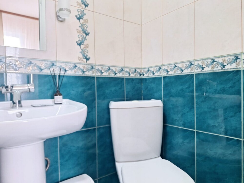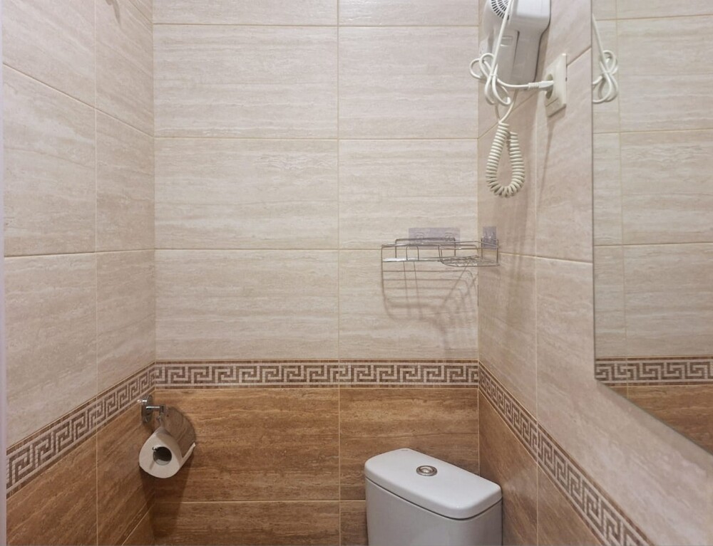 Индивидуальная ванная комната: душ, раковина, туалет, тапочки, фен, ванные принадлежности
