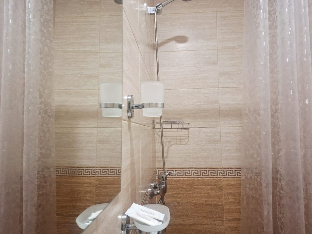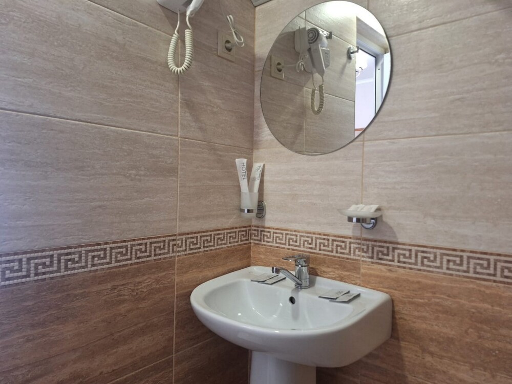 Индивидуальная ванная комната: душ, раковина, туалет, фен, тапочки, ванные принадлежности.
