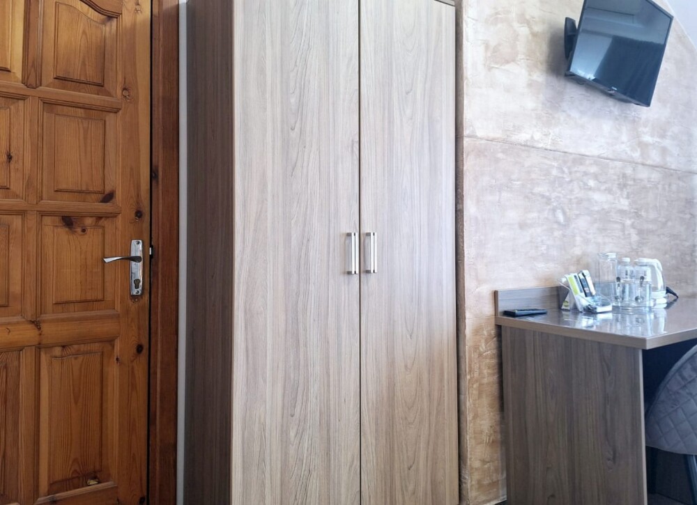 Имеется сейф, антимоскитная сетка, плотные шторы, телевизор, кондиционер, шкаф, вешалка, зеркало, стол рабочий, посуда, столовые принадлежности, чайник, холодильник, стулья, корзина для мусора.