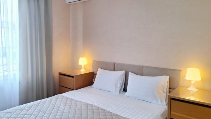 Имеется сейф, антимоскитная сетка, плотные шторы, телевизор, кондиционер, шкаф, вешалка, зеркало, стол рабочий, посуда, столовые принадлежности, холодильник, стулья, корзина для мусора.