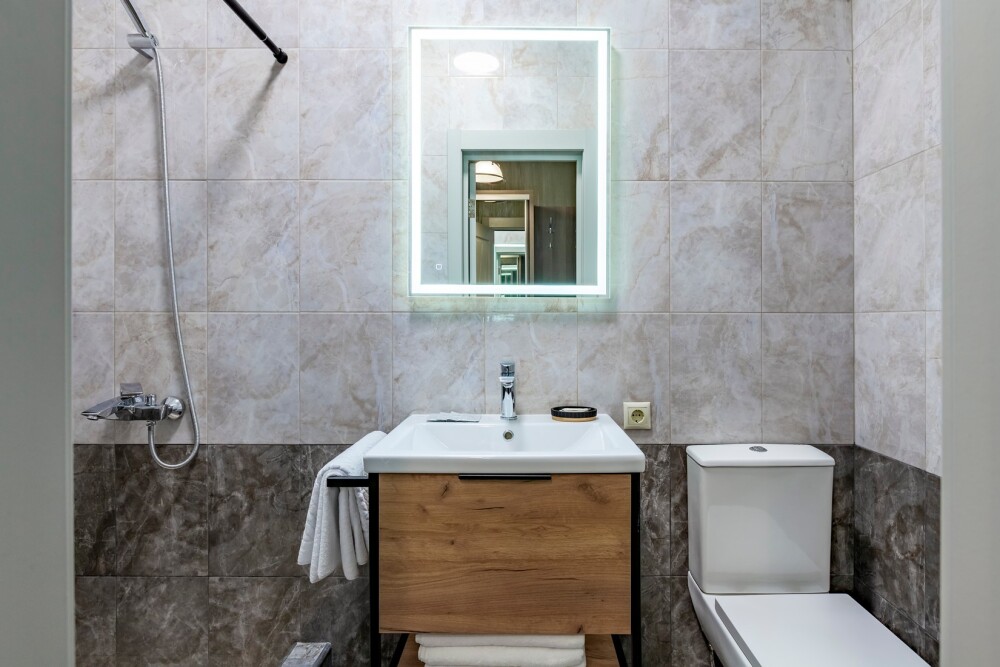 Индивидуальная ванная комната: душ, раковина, туалет, халат тапочки, фен, шампунь, утюг, гладильная доска.