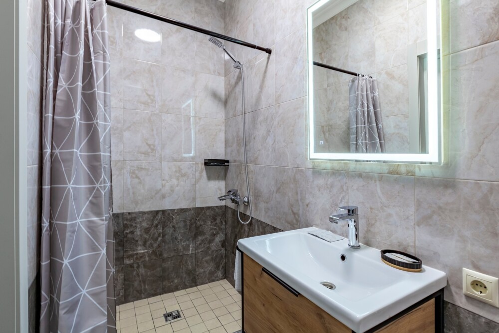 Индивидуальная ванная комната: душ, раковина, туалет, халат, тапочки, фен, утюг, гладильная доска, шампунь.