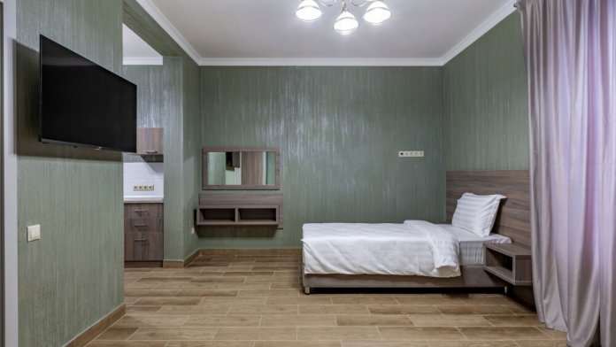Имеется: мини кухня, посуда, телевизор, кондиционер, вентилятор, шкаф, вешалка, стол, стулья, чайник, холодильник.