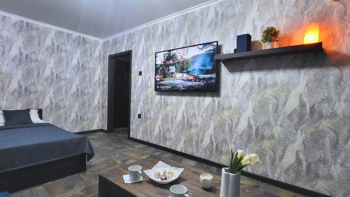 Новая двуспальная кровать с ортопедическим матрасом и новый диван 140х200 см помогут разместиться гостям в количестве до 4-х человек. Имеется вся бытовая техника: Smart TV диагональ 55 дюймов, фен, сплит-система, холодильник, стиральная машина, эл. чайник, утюг и гладильная доска, микроволновка. Вся необходимая для проживания посуда и моющие стирающие средства. Гели для душа, жидкое мыло, твёрдое мыло, антибактериальные средства для обработки всех сантехнических поверхностей.